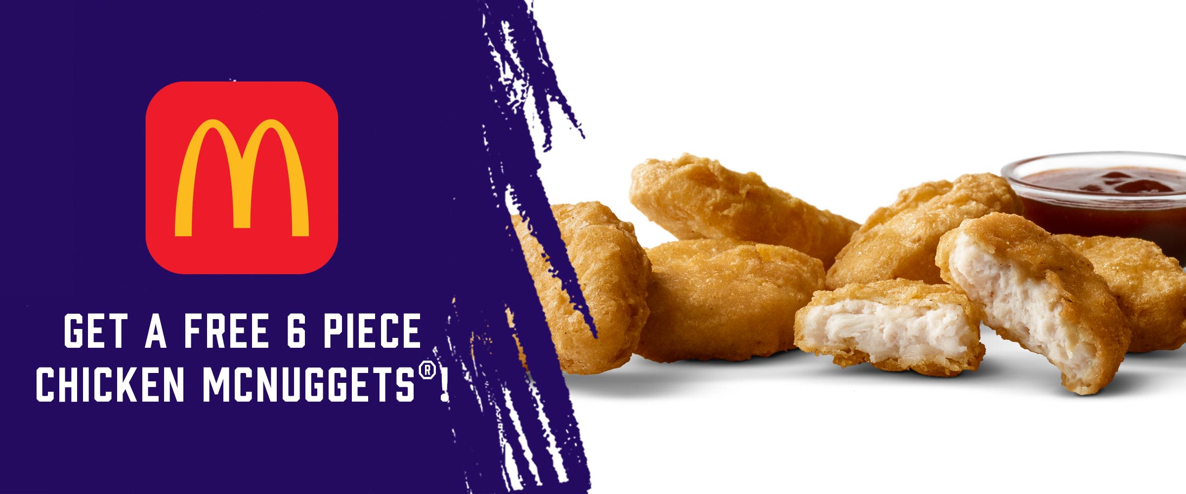 FREE 10pc Chicken McNuggets at McDonald's | Food & Drink Samples | Freebies Get a FREE 10-piece Chiken McNuggets when you download the McDonald's app and join MyMcDonald's Rewards! when you download the McDonald's app and join MyMcDonald's Rewards! Plus, get your choice of Hash Browns, Vanilla Cone, McChicken, or a Cheeseburger free after your first purchase. Valid thru 12/31/22 for first time app users at participating McDonald's.