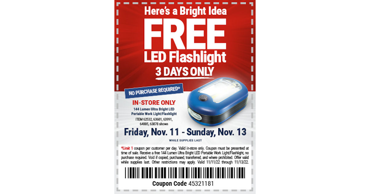 Harbor Freight Coupons - Harbor Freight Coupons GET NEW COUPONS Harbor Freight Coupons Updated: [current_date format='l n/j/Y'] 144 Lumen Ultra Bright LED Portable Worklight/Flashlight for FREE Code 45321181 · Exp. 11/13/2022 PREDATOR 6500 Watt Gas Powered Portable Generator with CO SECURE Technology for $599.99 Code 64229596 · Exp. 11/13/2022