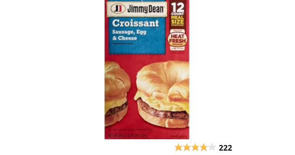Amazon.com: Frozen: Grocery & Gourmet Food: Ice Cream Jimmy Dean® Butcher Wrapped Sausage, Egg & Cheese Croissant, 4.9 oz (12 count) 4.9 Ounce (Pack of 12) 4.0 out of 5 stars 110. ... 5% coupon applied at checkout Save 5% with coupon. $12.21 delivery Nov 30 - Dec 5 . Or fastest delivery Tue, Nov 29 . Climate Pledge Friendly. Small Business.