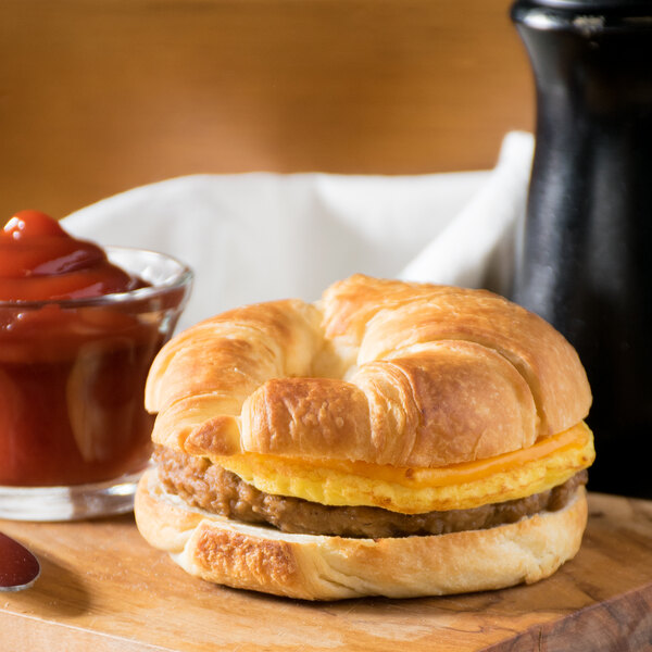 Jimmy Dean 4.8 oz. Sausage, Egg, and Cheese Breakfast Croissant - 12/Case Layered with hearty Jimmy Dean sausage, a premium fried egg, and melty cheddar cheese Pre-cooked and ready to heat and serve Comes on a buttery croissant roll The satisfying way to start any day Ships frozen UPC Code:400013218582 Shipping: Quick Shipping Usually ships in 1 business day View all Jimmy Dean Breakfast Sandwiches